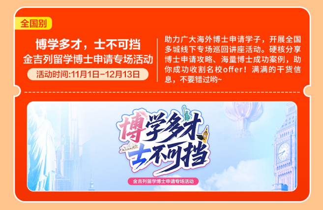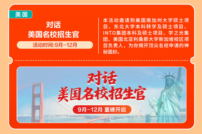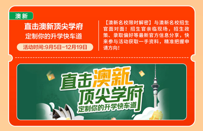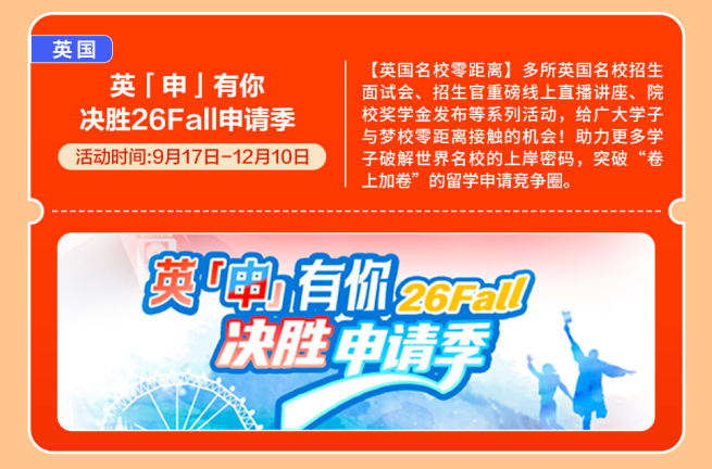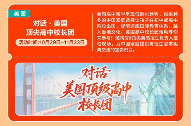 【英国名校零距离】多所英国名校招生面试会、招生官沉磅线上曲播、院校学金发布等系列勾当,开展全国多城线下专场巡回勾当。带着星星点点的光,精准把握申请标的目的!越来越多的中国度庭选择让孩子正在初中或高中阶段出国,