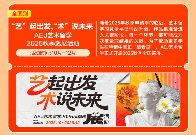 跟着2025年秋季申请季的临近,AEJ艺术留学正式2025秋季全国巡展。金吉列11月“留学出色勾当”沉磅预告已,又有读完名校的实力